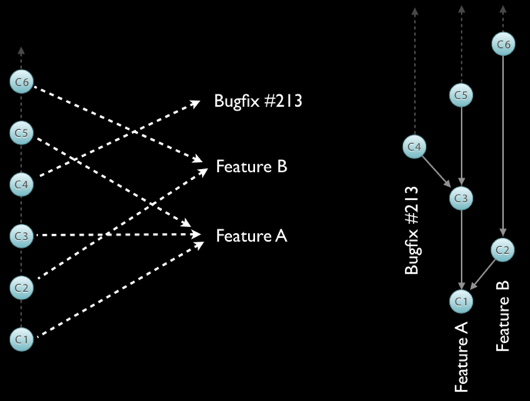 In contrast, mixing up a little bit from feature X, the code for bugfix #324, and a function for feature Y in a single commit is a recipe for chaos. A developer that works solely on feature X will then have to inspect that whole, bloated commit and figure out what's relevant for him.