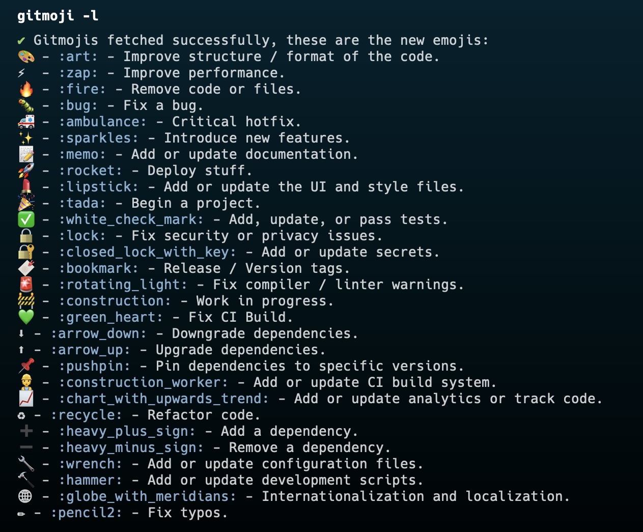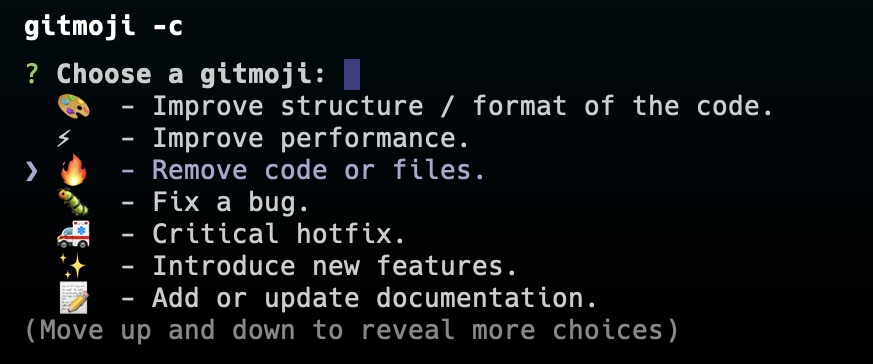 These commands should get you up and running in no time. For a complete list of options, we recommend referring to the available documentation here (or simply type gitmoji --help).