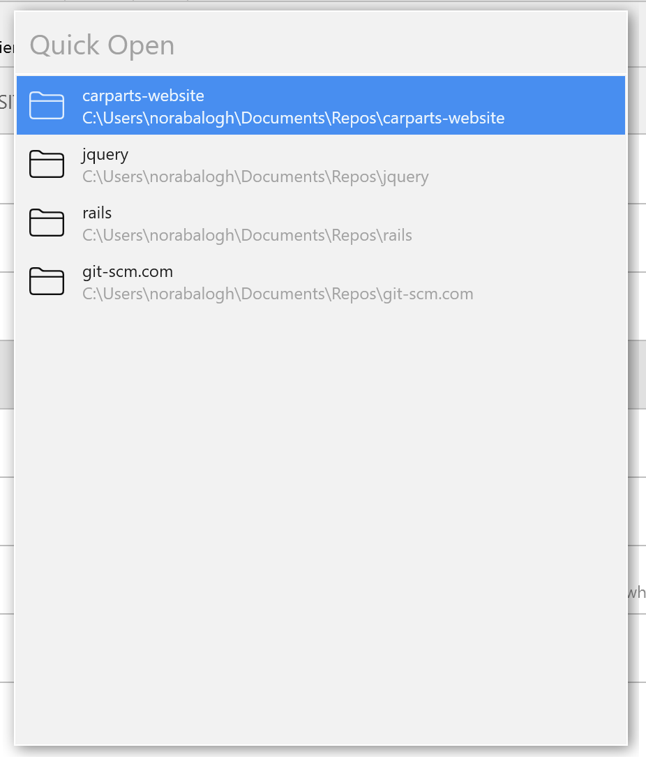 - Press CTRL + O to show the Open Quickly dialog. Start typing any part of the repository’s name.