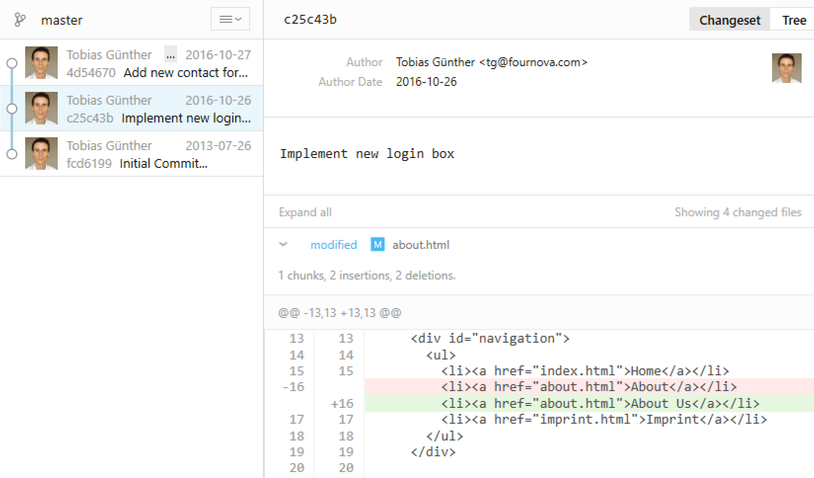 Before we take a closer look at such a diff, we'll be looking at the different places in Tower where diffs are displayed: