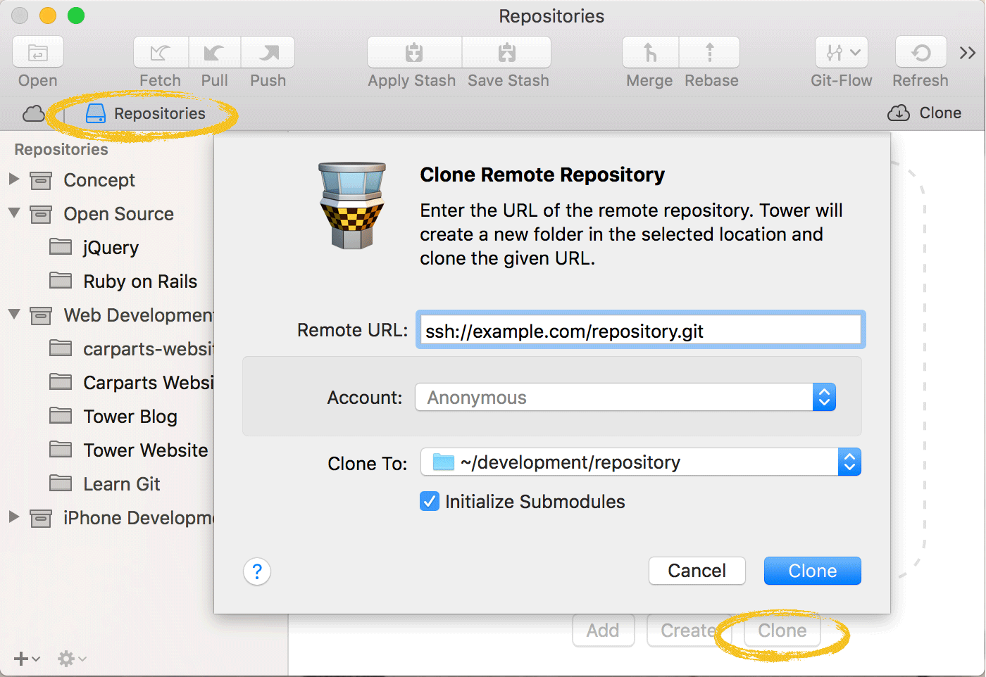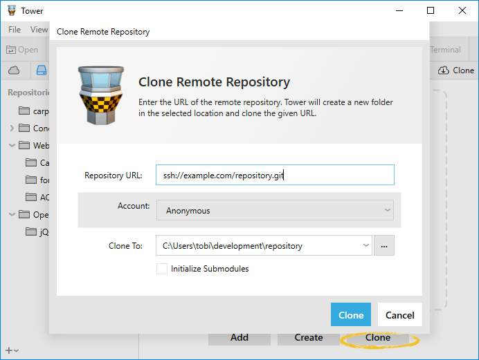 Once you've connected your account with Tower, you can clone your repositories with just a single click - without having to enter URLs or authentication credentials anymore.
