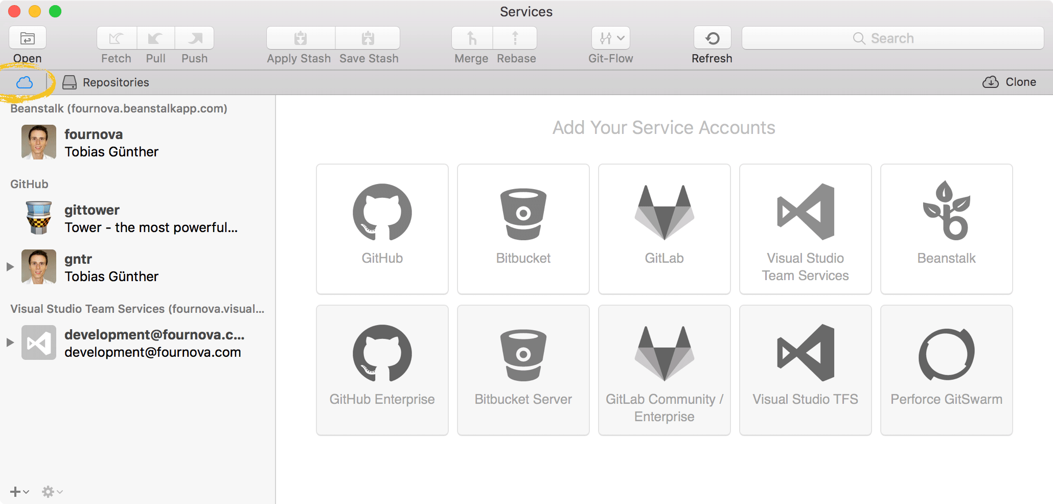 Switch to Tower's Services view by clicking the little cloud icon below the toolbar. There, click the button that corresponds to the hosting service of your choice to start connecting your.