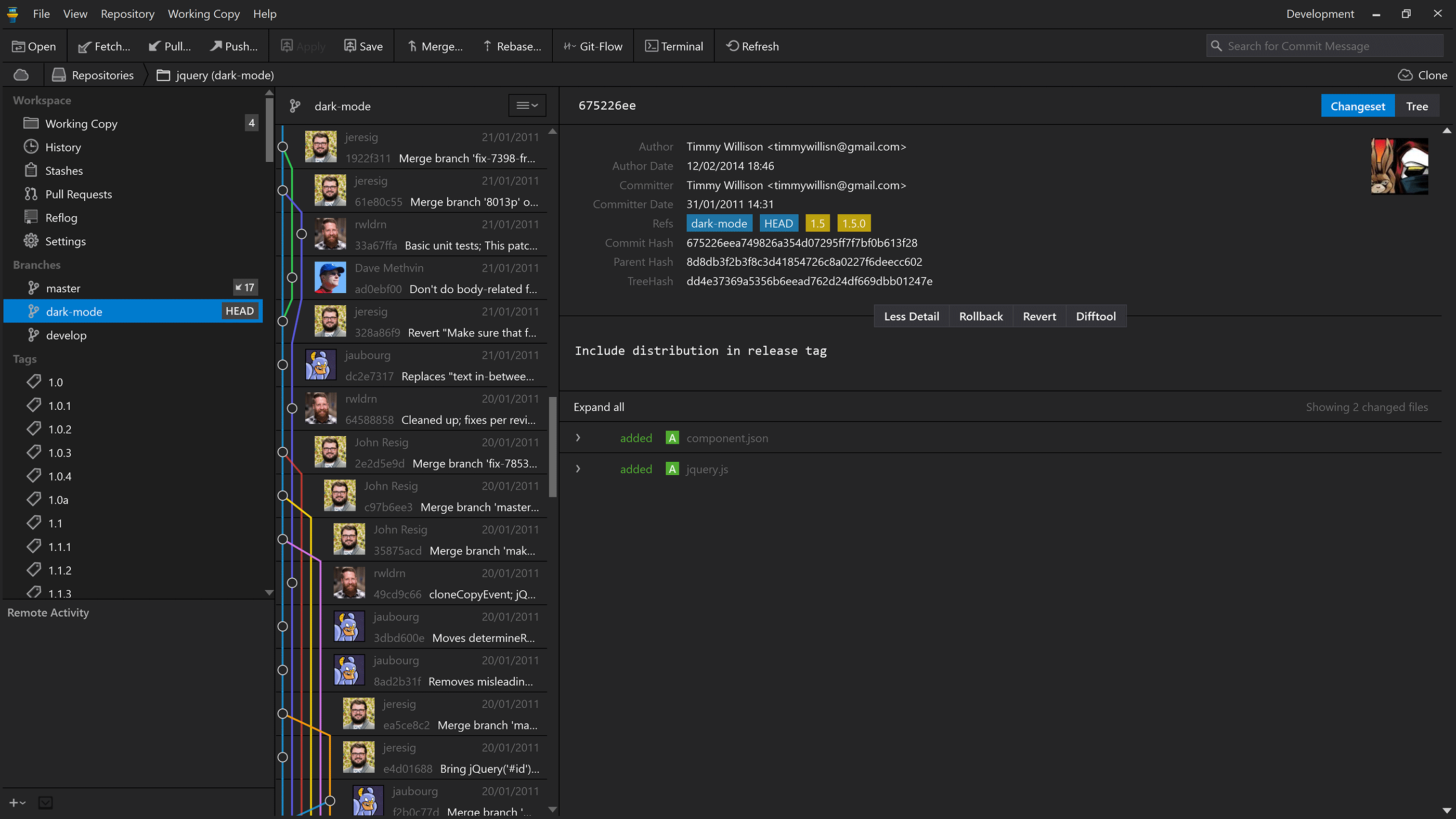 The commit history view in the upcoming "Dark Mode" release of Tower for Windows.