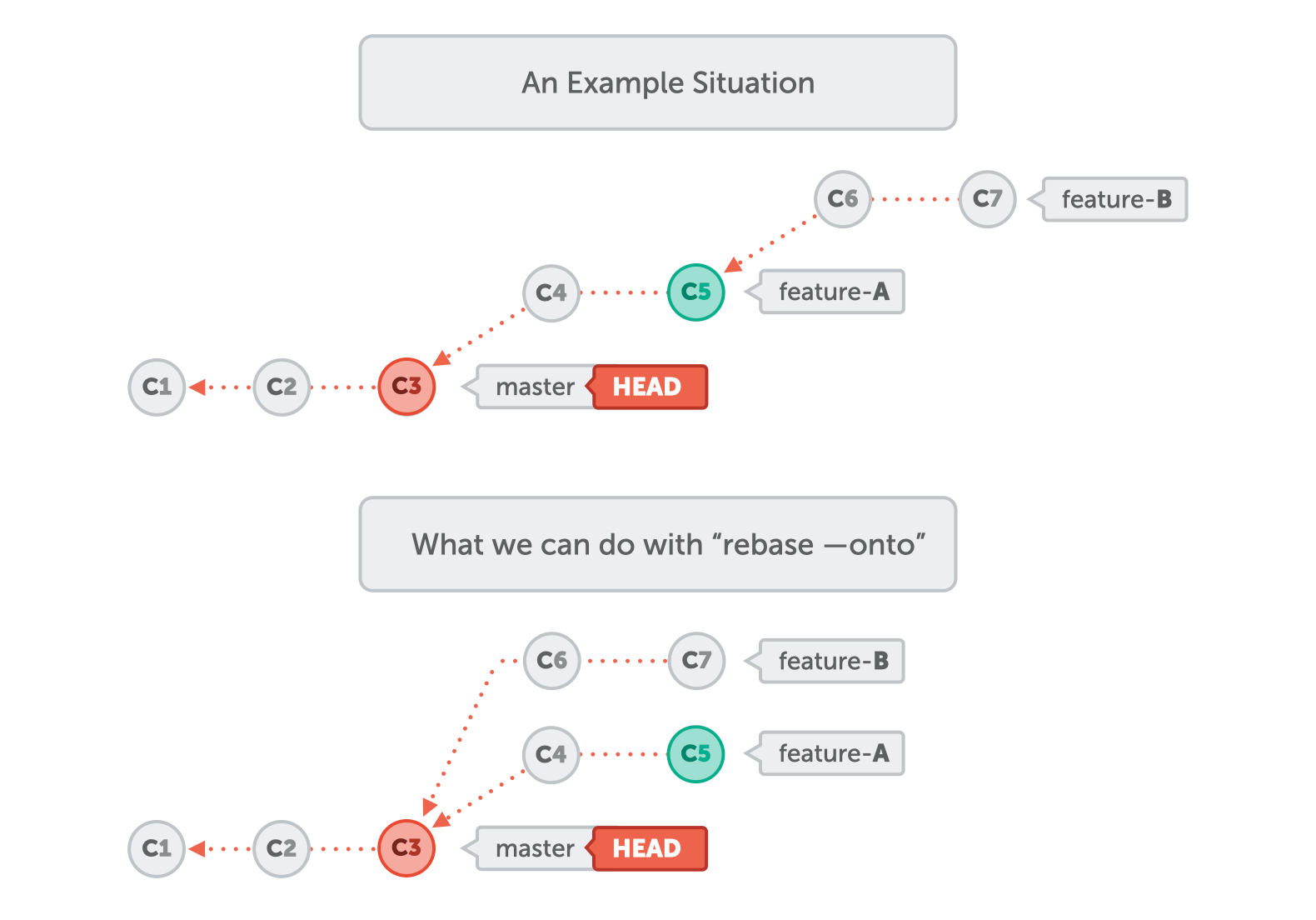 The "Rebase" command is well known in Git, but not its --onto option, which can be immensely helpful. In short, rebase --onto allows you to "switch the base" for a series of commits.