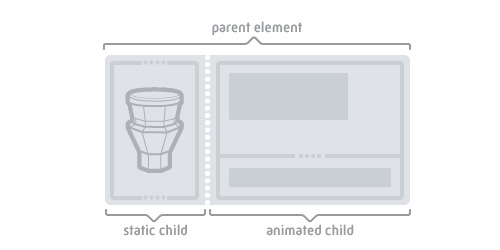Inside the parent we nested 2 elements which basically represent the left side (which remains flat) of the ticket as well as the right side (which flips on mouseover). For easier usage and less HTTP requests we rely on a single background image instead of slicing up the image in two parts. The single background image is applied to both child elements as a background image. For pixel-precise alignment both child elements make use of "position:absolute" while the parent has "position:relative" applied. By adjusting the "background-position" of the graphics as well as absolute positions of the child elements we put the graphic together as one single piece.