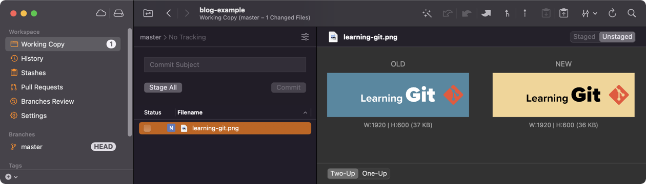 Let's start with a basic task: we will write a blog post in Markdown format, add a featured image, and commit the two files. Then, we will make some modifications to the image and commit those changes to the project.