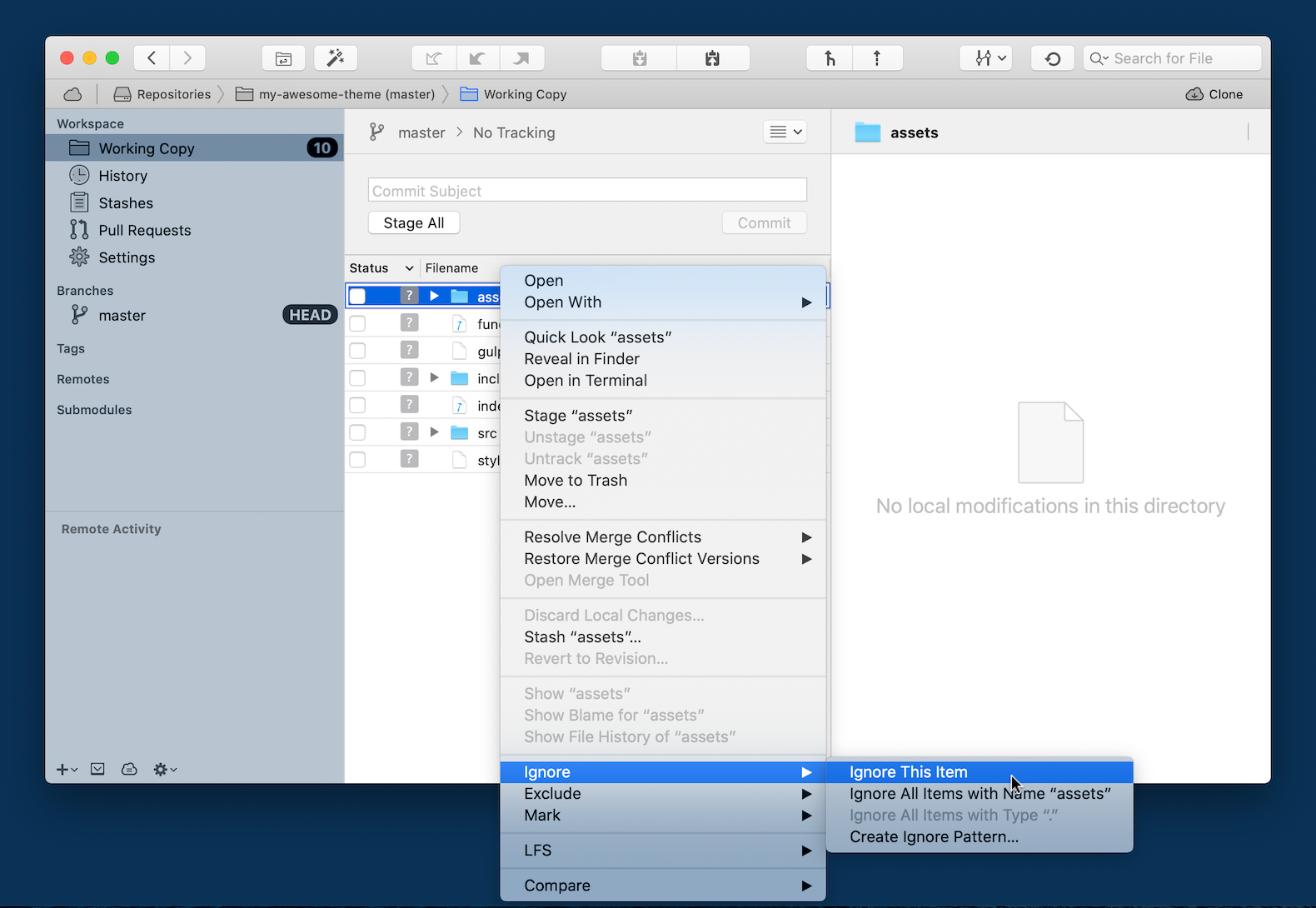 Again, we don't want the assets directory to be added to the repository, as its files are automatically generated. The same goes for the style.css file. To accomplish this, we just right-click the files inside Tower, choose "Ignore → Ignore This Item", and Tower will generate the .gitignore file for us: