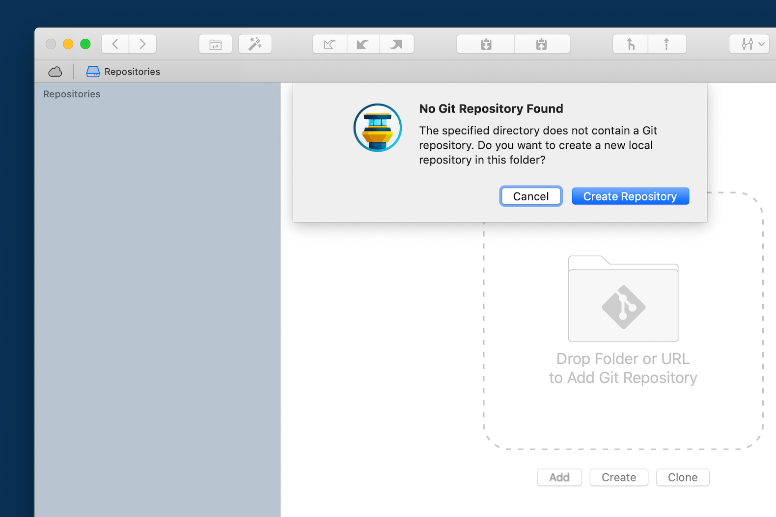 To initialise a repository here, we just drag the folder into our repositories in Tower and choose "Create Repository":