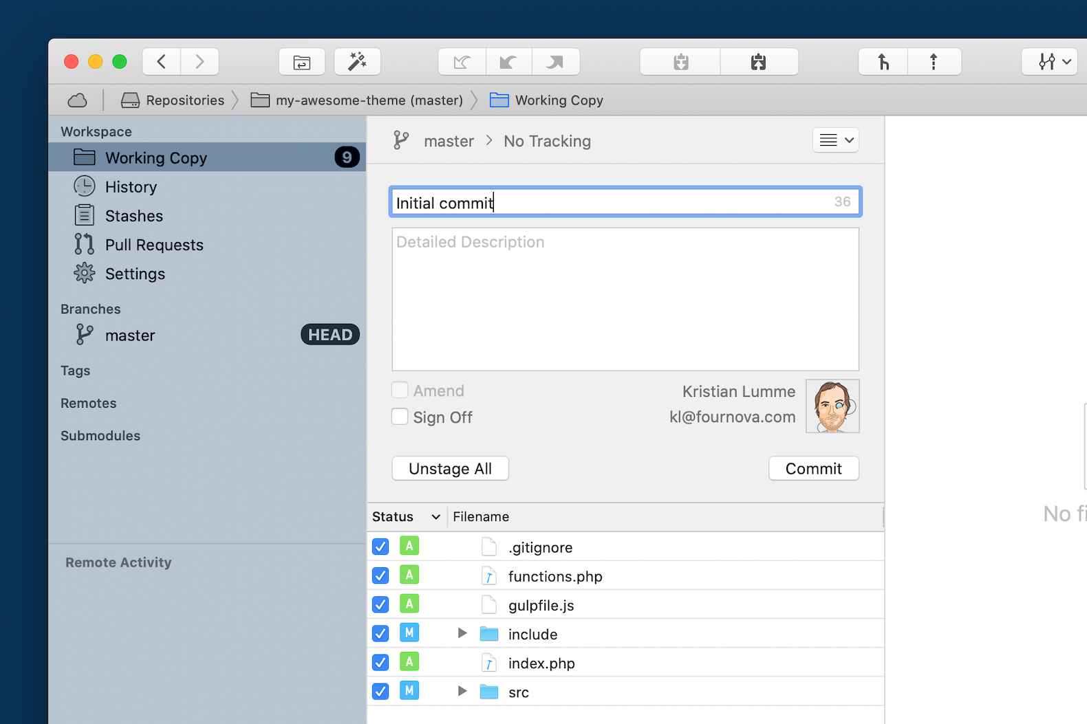 We stage all the files and create our initial commit: