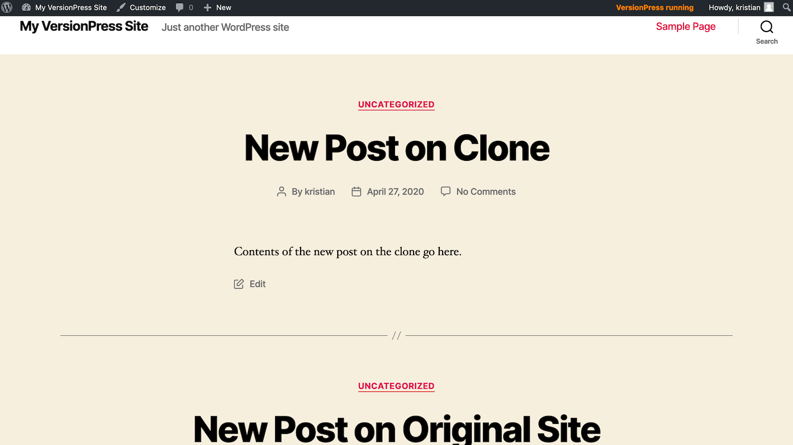 To go from cloned repository to working site, I've used the WP-CLI restore-site command. This requires some extra steps, which are listed in the official documentation for VersionPress. Let's appreciate how useful this is for a moment: we get a complete, working copy of the previous site, including the database, based on nothing but a Git repository! In this case, both sites are running on the same machine, but if we were to use a service like GitHub to push and pull commits between the projects, they could just as easily be running on different machines.