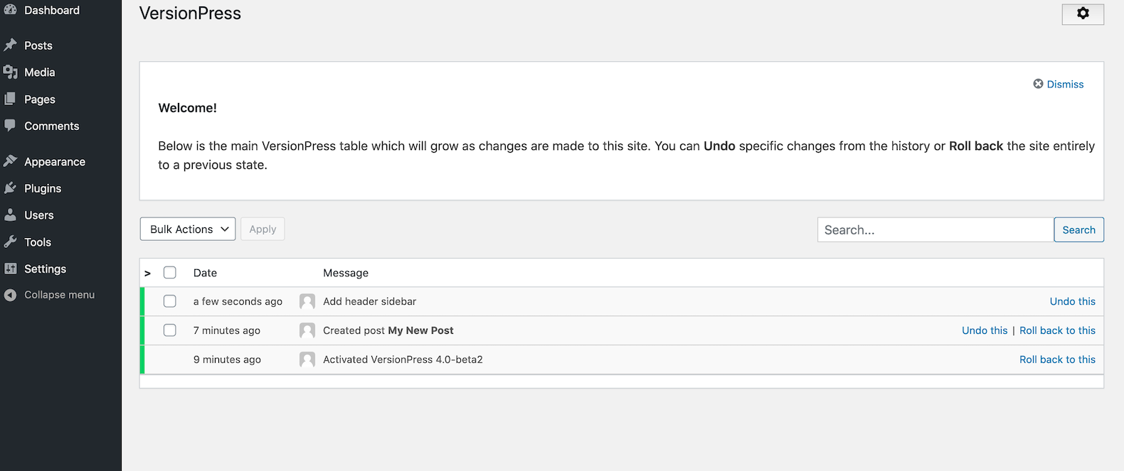 VersionPress is an interesting and very ambitious plugin, aiming to integrate WordPress directly with Git. In particular, database updates are now version-controlled, meaning things like changing an option or creating a new post will result in Git commits. Behind the scenes, VersionPress relies on pure Git, letting us use standard Git commands and workflows to work on our site.