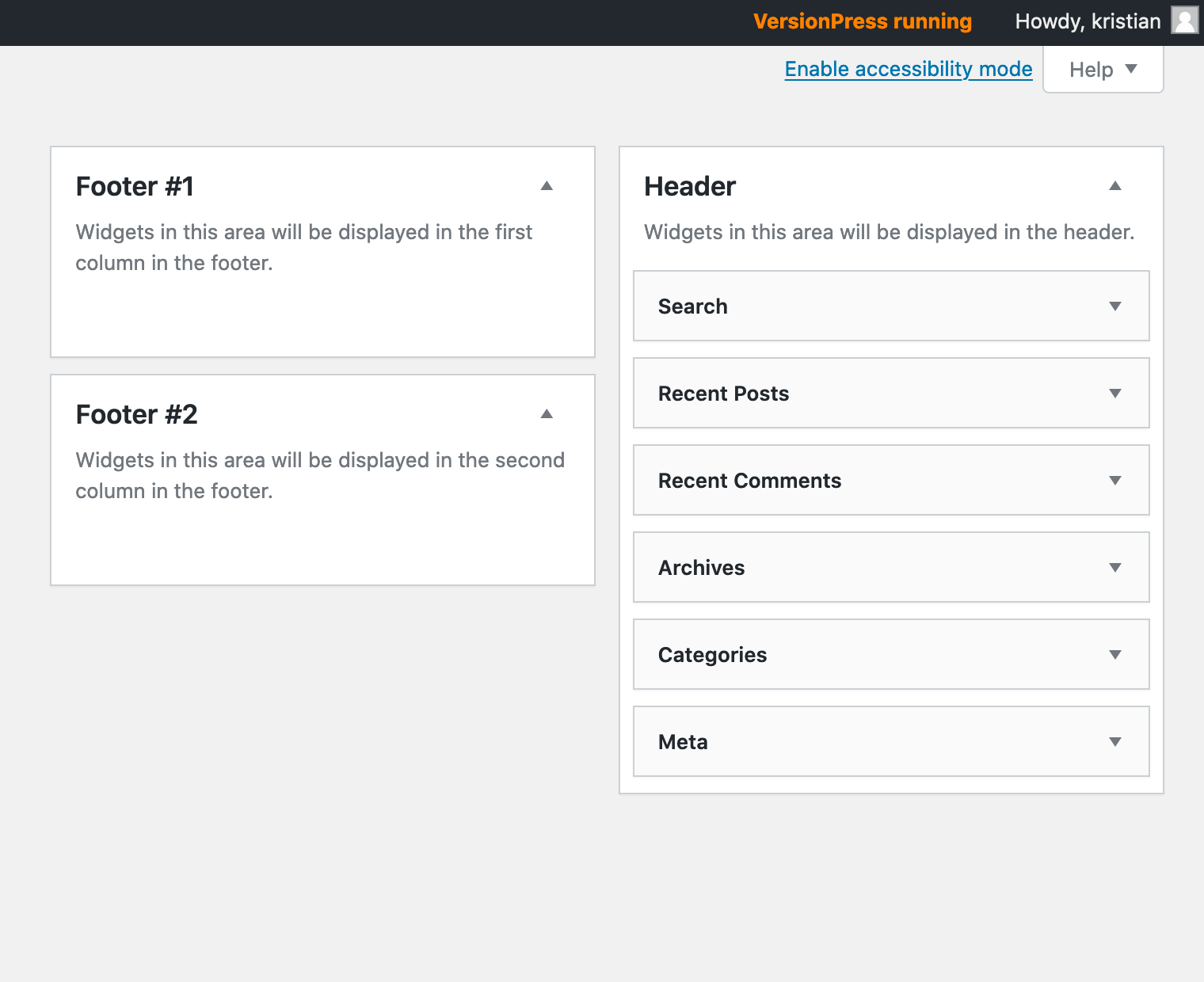 We then make a change in the database that depends on the code change in the previous step. Let's go to the "Widgets" admin page and move all widgets from the other sidebars into the "Header" sidebar.
