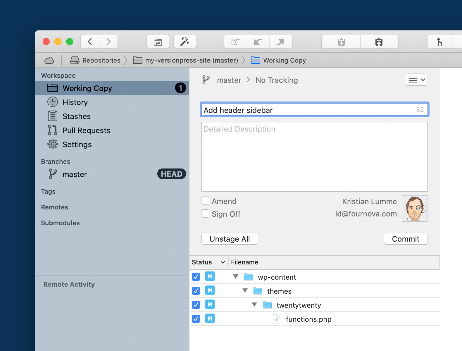 Now, if we take a look at the VersionPress page, VersionPress notes that we have uncommitted changes in our repository, but it doesn't create a commit by itself. We will create the commit ourselves in Git. Let's use the Tower Git client for this one: