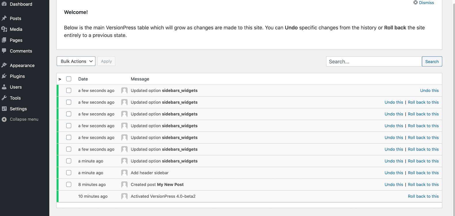 Now we're in the scenario described before: we've made a change (moving widgets to a new sidebar) that touches both the code and the database, and just rolling back the code change does not restore the state before it was introduced. However, with VersionPress, we can roll back the change! Just click "Roll back to this" on the change before we added the new sidebar in functions.php, and things will be back as they were before!