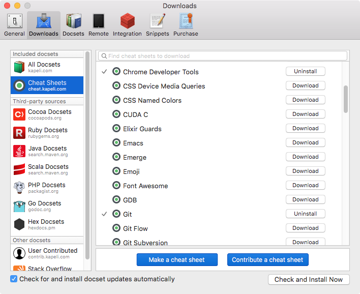 For this use case, Dash has you covered with its extensive collection of cheat sheets. Install them just like any other documentation via the app's Preferences > Downloads tab.
