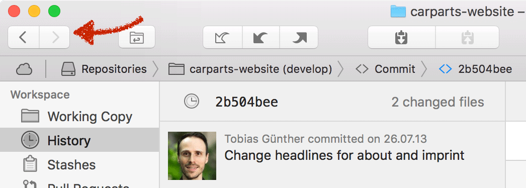 - double-click a commit in the History to see a detailed view of the changes