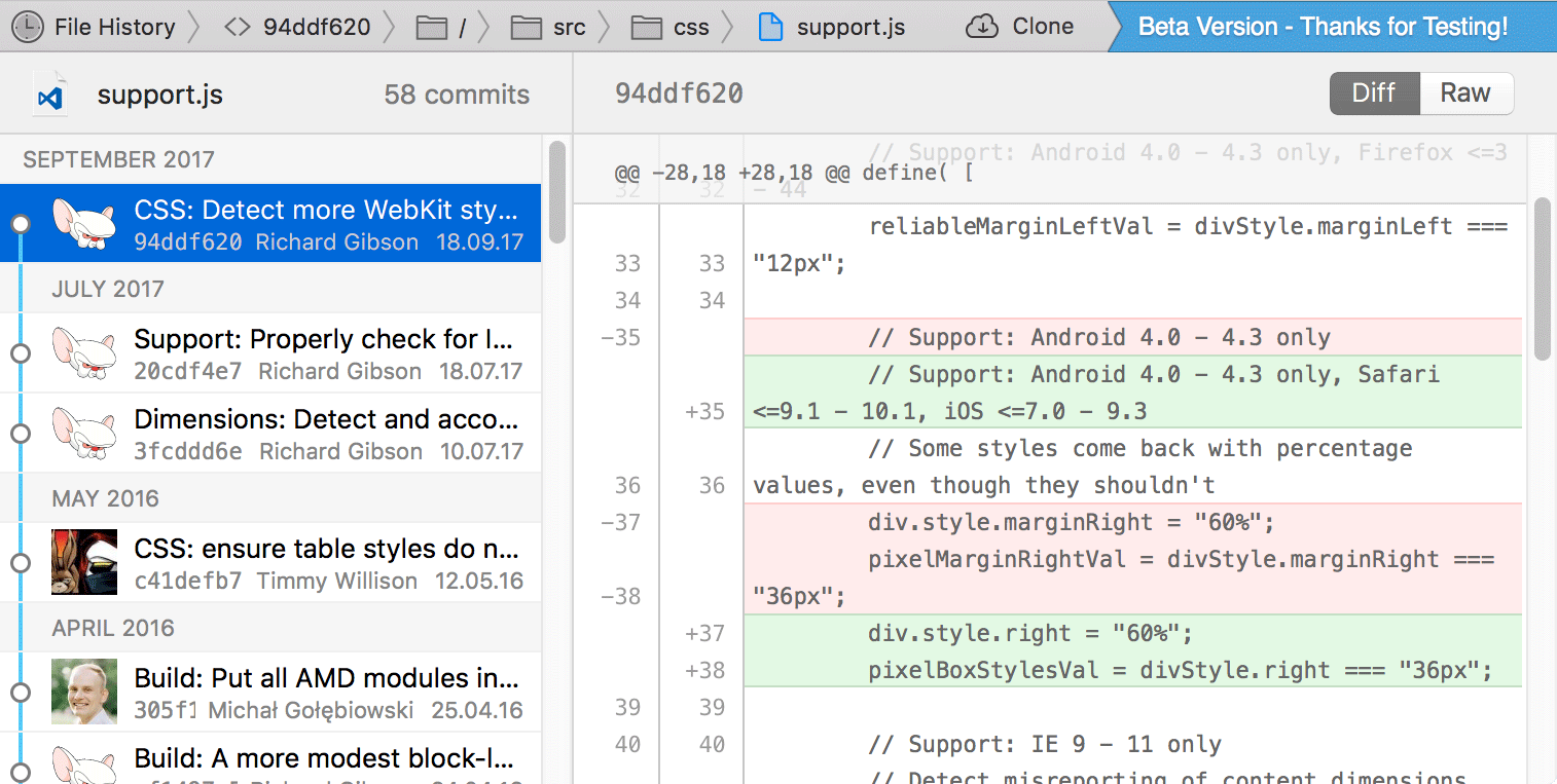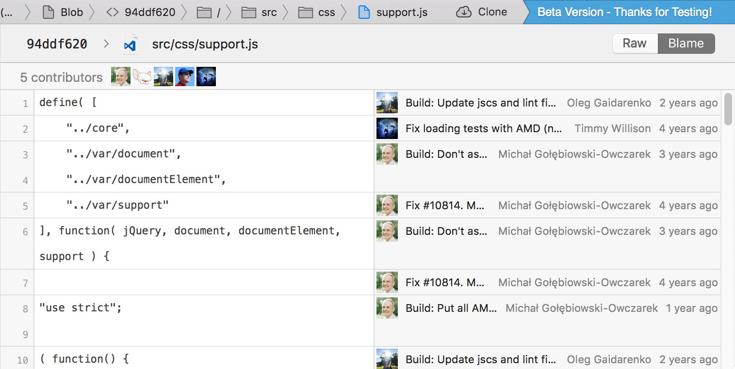 We have redesigned both the "File History" and "Blame" views from scratch. They have become so much more useful and informative. As proof, here's the new "File History"...