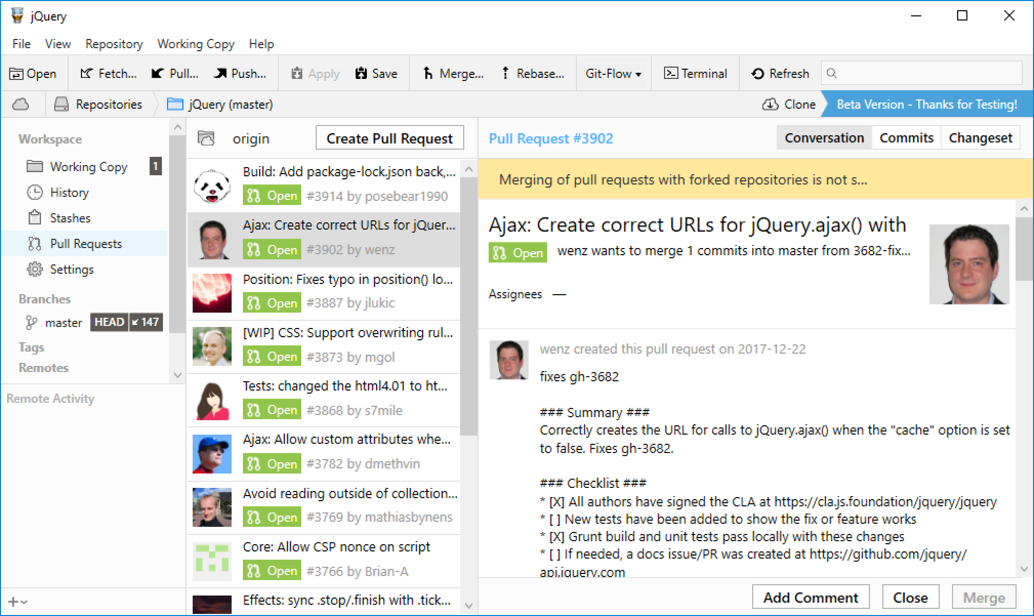 Create, merge, close, comment and inspect Pull Requests right from within Tower! I'm confident that you'll realize exactly what I've realized: Pull Requests become so much more useful when they're available in our clear, responsive, and powerful desktop interface!