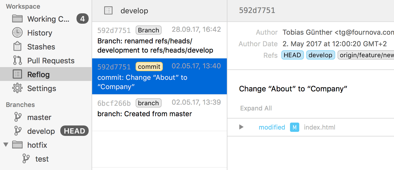 While we're at it: please open Tower's preferences and, just to try it out, check the option to "Show Reflog in sidebar". This will add a new "Reflog" item to the sidebar: