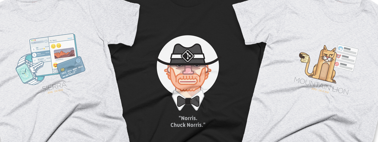 Our T-shirts and posters touch a broad range of topics: from our favorite superhero Chuck Norris and Apple's Mac OS Cats...
