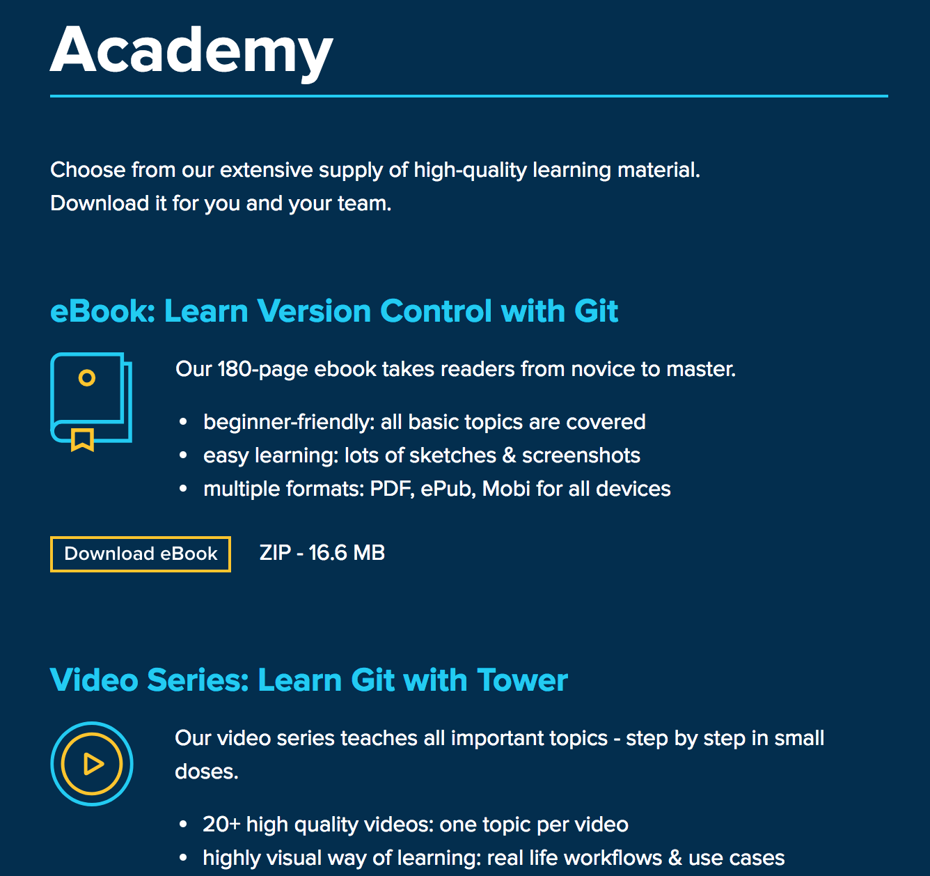The Academy page offers a host of high-quality learning material - around Tower, Git, and version control in general.