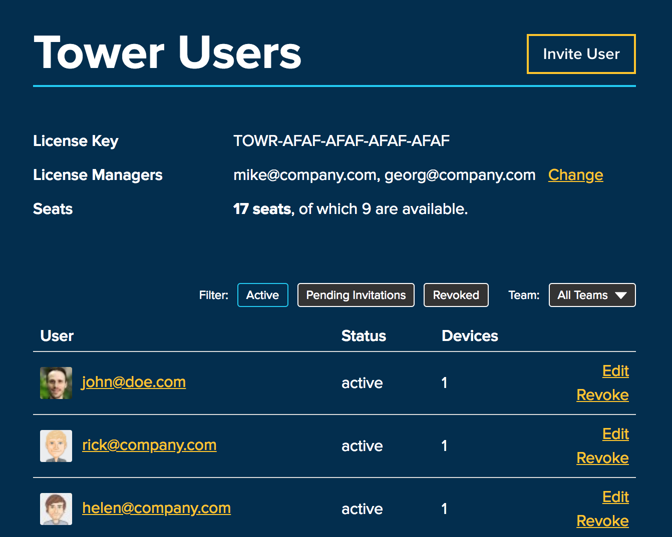 The Tower Users page helps you manage your Tower seats. It displays basic information about your license and a list of all invited users.