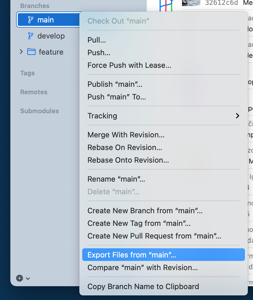To do so, right-click the branch in the sidebar and choose from the contextual menu.