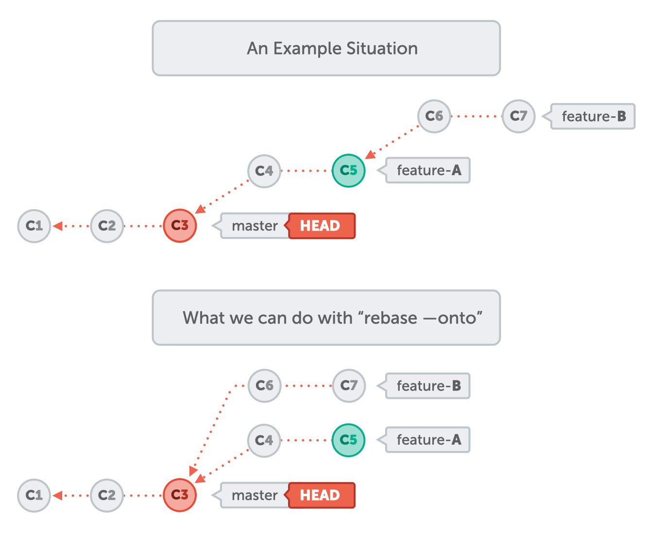 The "Rebase" command is well known in Git, but not its --onto option, which can be immensely helpful. In short, rebase --onto allows you to "switch the base" for a series of commits.