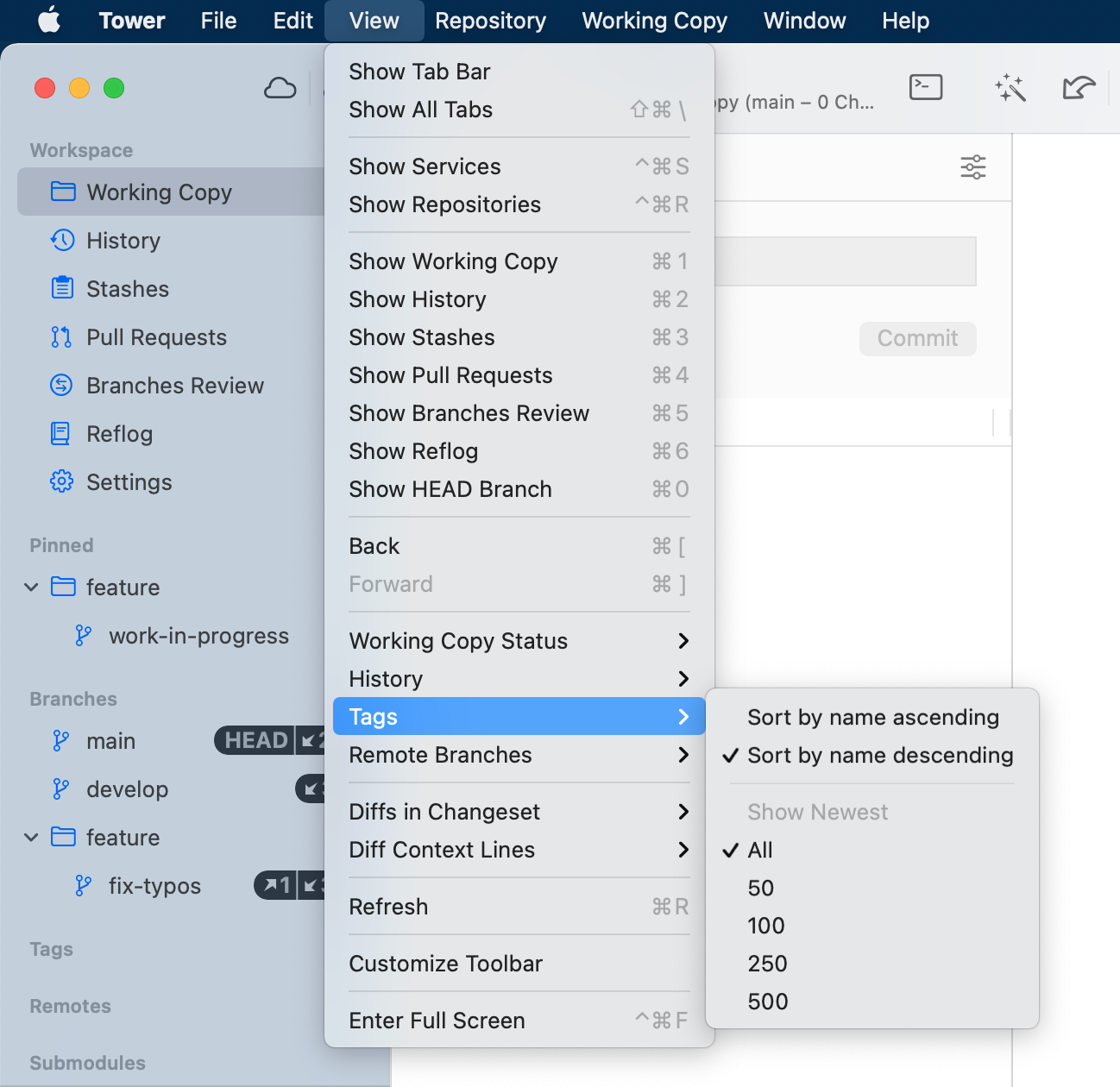 Tags and Remote Branches can be filtered to show only the newest 50/100/250/500.