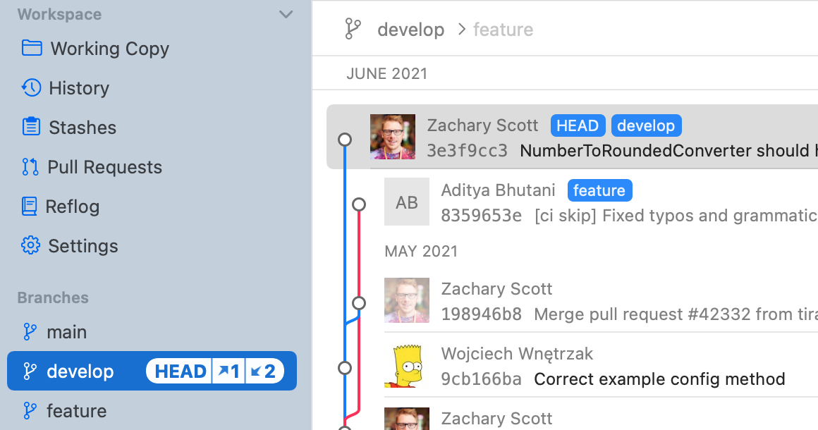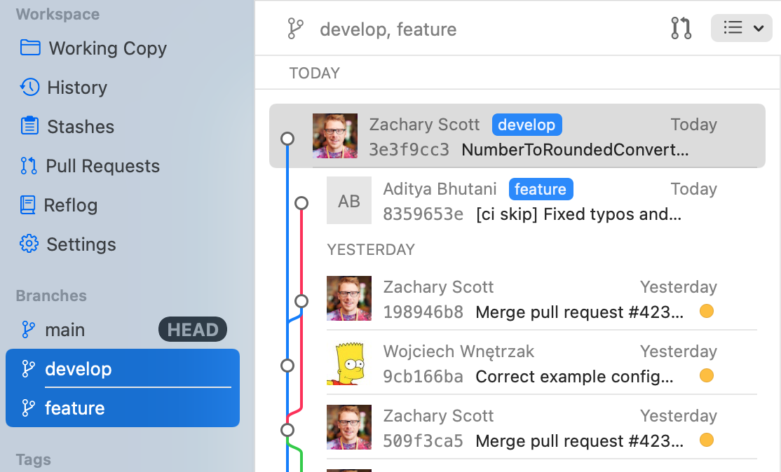 Select one or multiple local or remote branches or tags to see a combined history of only these refs. E.g. if you select the local branches "master" and "feature/login" as well as the remote branch "origin/develop", you will only get a list of commits from these three branches.