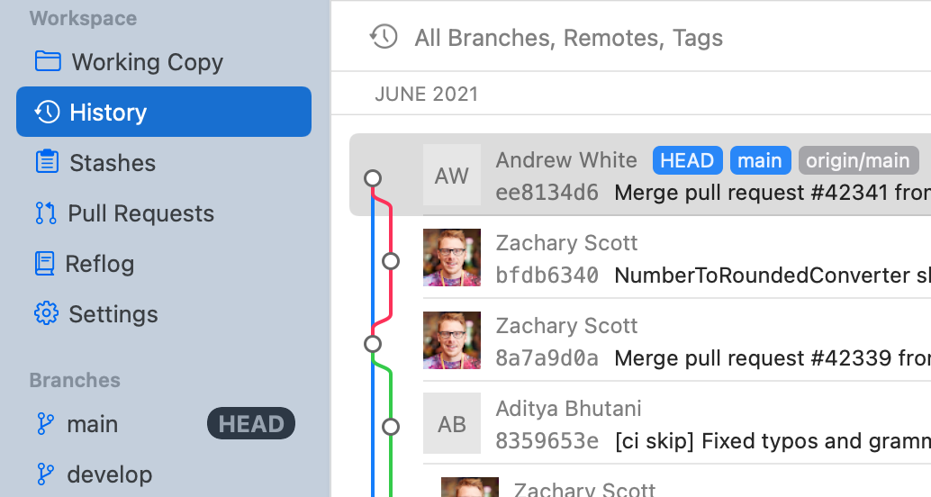 Tower lets you choose very flexibly, which exact portion of your repository's history you want to see. The selected item(s) in Tower's sidebar determine what you see: