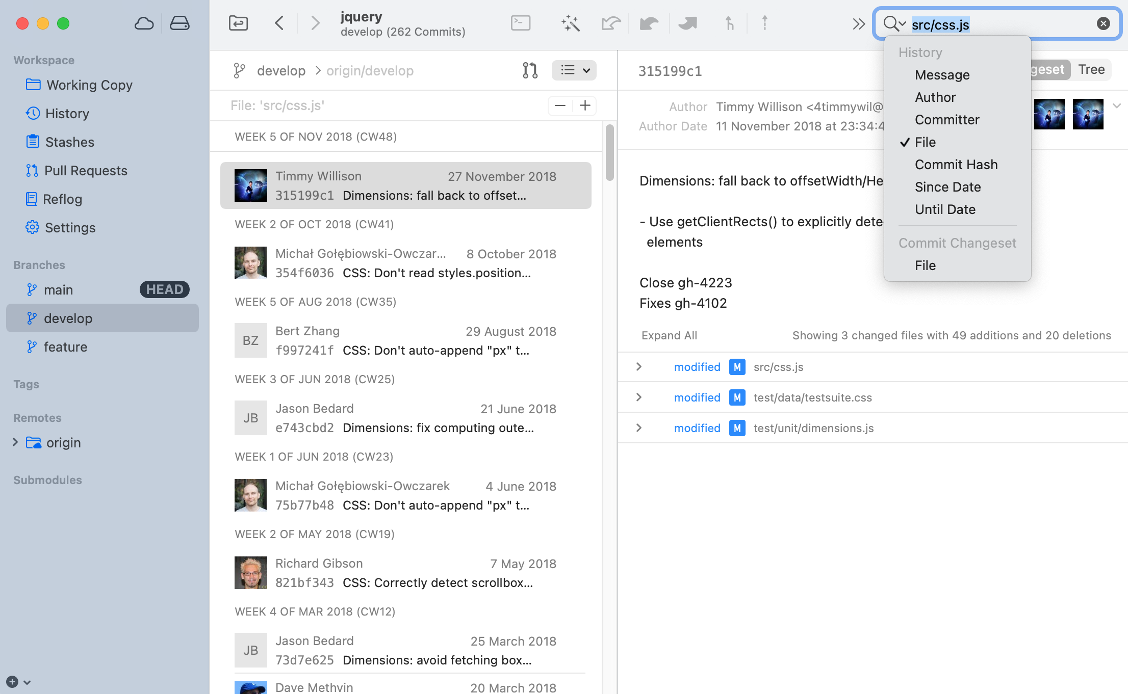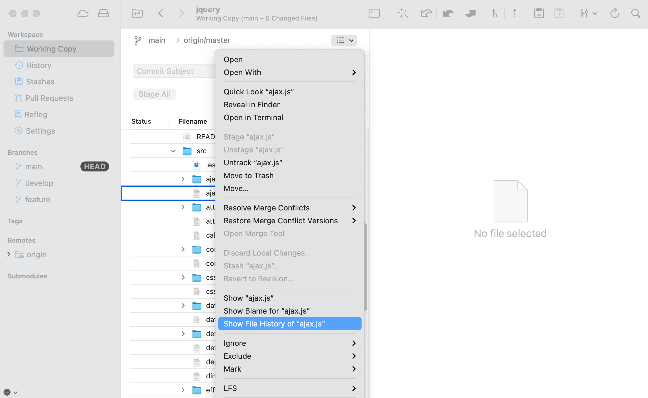 Another way to access a single file's commit history is through Tower's Working Copy view.