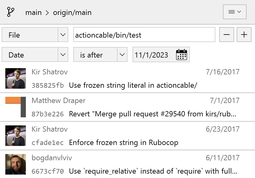Tower allows you to filter commit listings by various criteria.