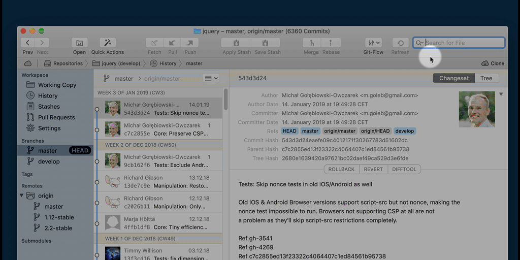 The search feature in Tower's view allows you to quickly filter the list to just the commits you need. Make sure to set the right category by clicking on the magnifying icon - and search for a commit's message, author, hash, or even files.