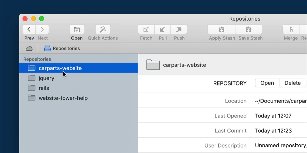 The view lets you order your bookmarks however you like - simply via drag and drop. Additionally, however, you can also have Tower re-sort them alphabetically: right-click an item and select from the contextual menu.