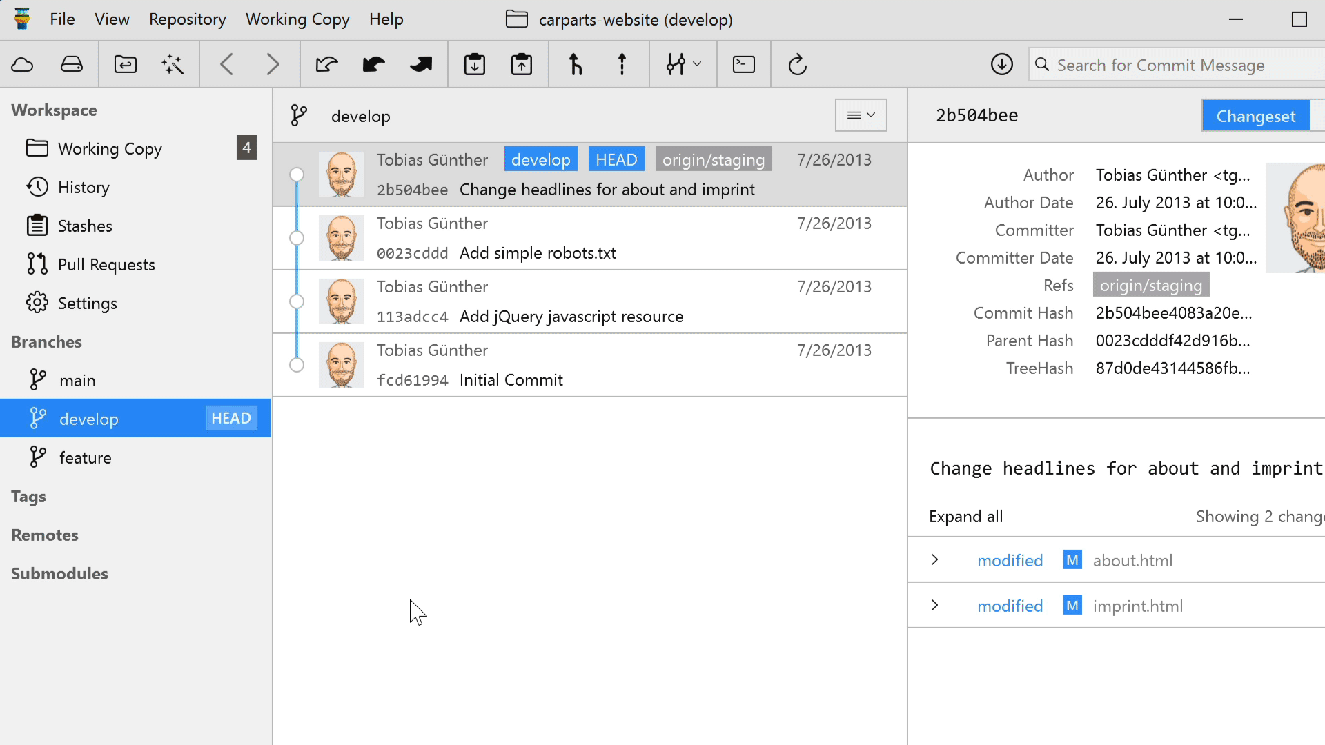Tower indicates directly in its History views if a commit was signed or not. On top of that, you can also see the signature status (green / orange / red) and access additional information through a popover window.