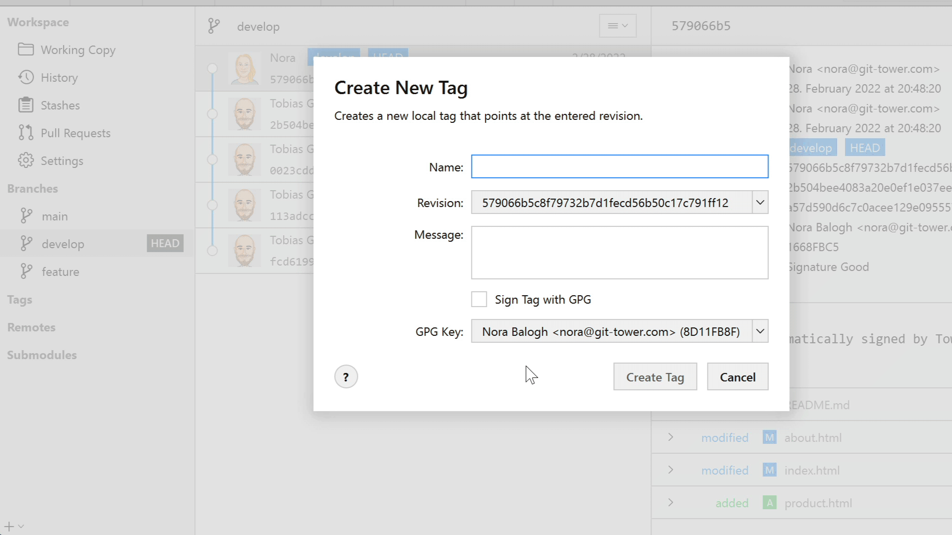 Apart from commits, you can also verify the signatures for tags in Tower. Either right-click on the tag in the sidebar or directly click it in one of the commit views.