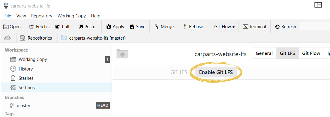 In the Git LFS tab, activation is as simple as hitting the Enable Git LFS button.