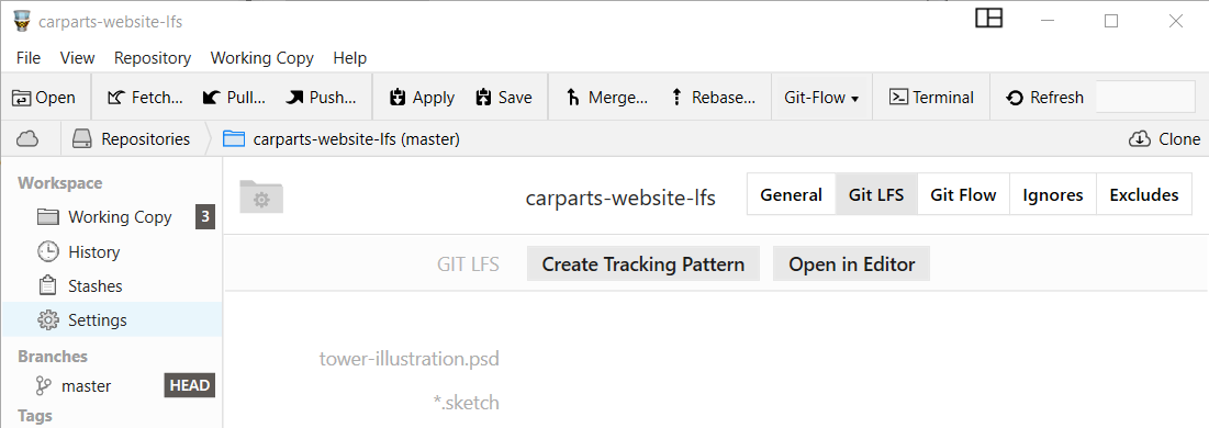 The Settings view provides an overview of which files / file types are currently tracked by LFS: