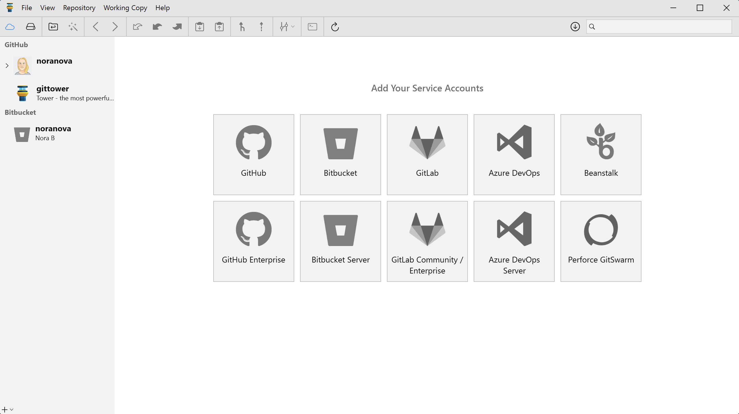 To connect one of your service accounts, you can use the button on the lower left of the sidebar. Alternatively, when no item is selected in the sidebar, you can simply click one of the large buttons on the right side.