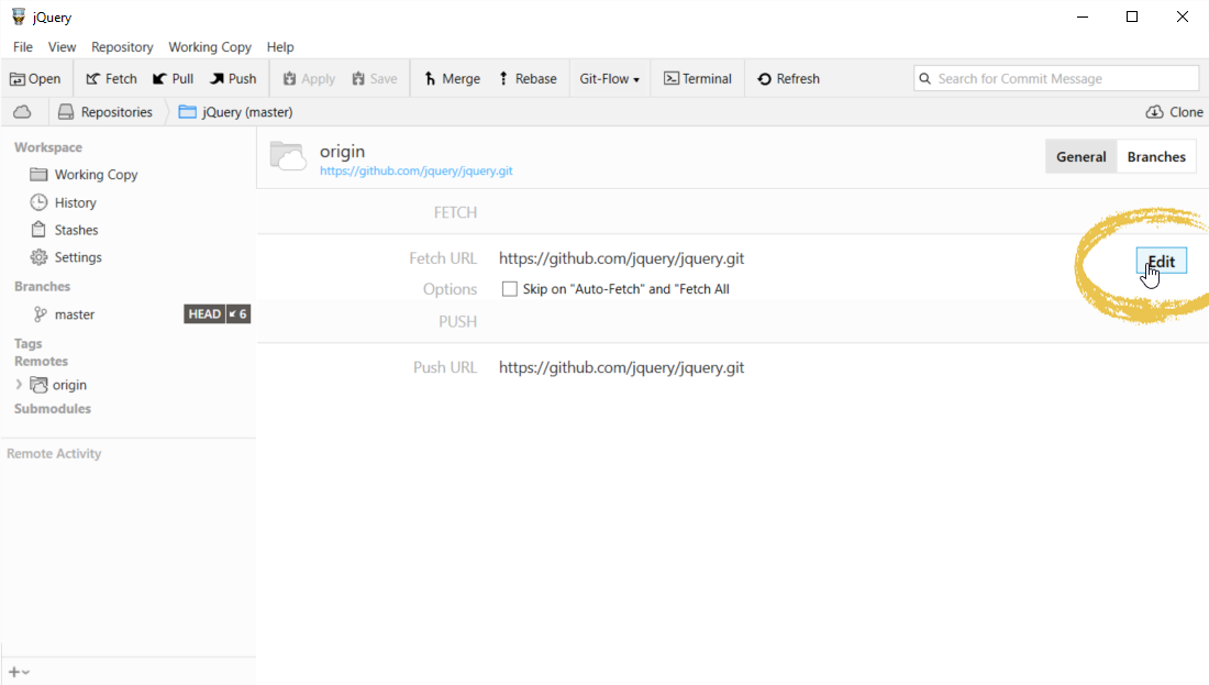 If you want to edit the default Fetch URL for a remote (which will be the case in most situations), you can use a shortcut: right-click the remote item in the sidebar and select .