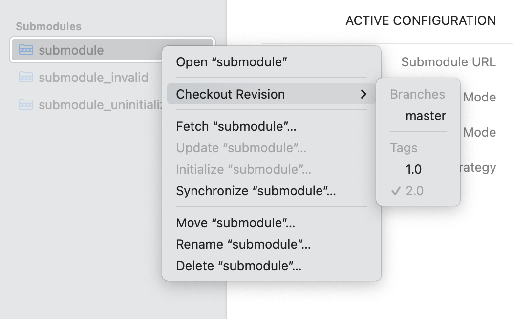- In the Submodule, select either the History item or any branch or tag in the sidebar