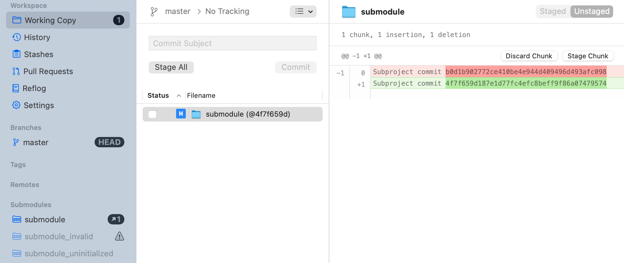 - Open the Submodule by double-clicking it in the sidebar (you'll notice that Tower's Navigation Bar is prolonged by the Submodule item)