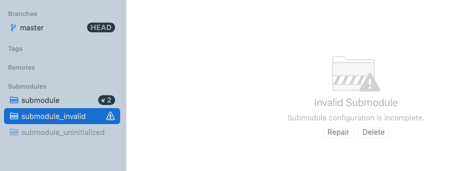 When not using Tower for adding and managing Submodules, it can easily happen that these configurations get out of sync - and become invalid. Tower highlights this status in the sidebar and when selecting such a Submodule: