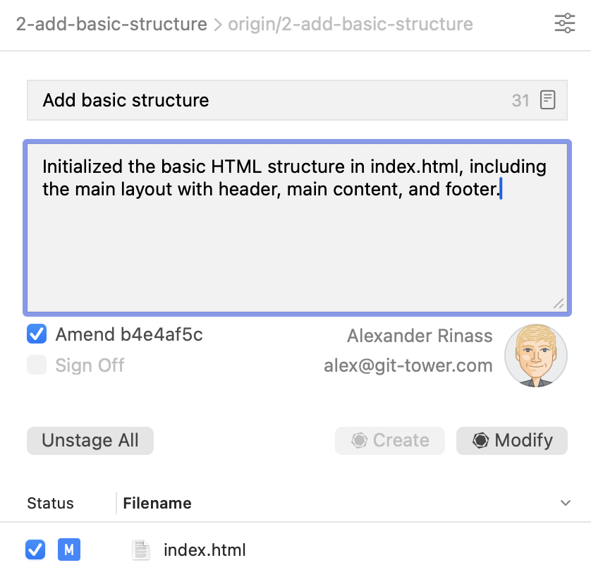 In Graphite terminology, "modifying" a commit means amending the last commit on a branch. This is particularly useful when you need to make small adjustments to your most recent changes: