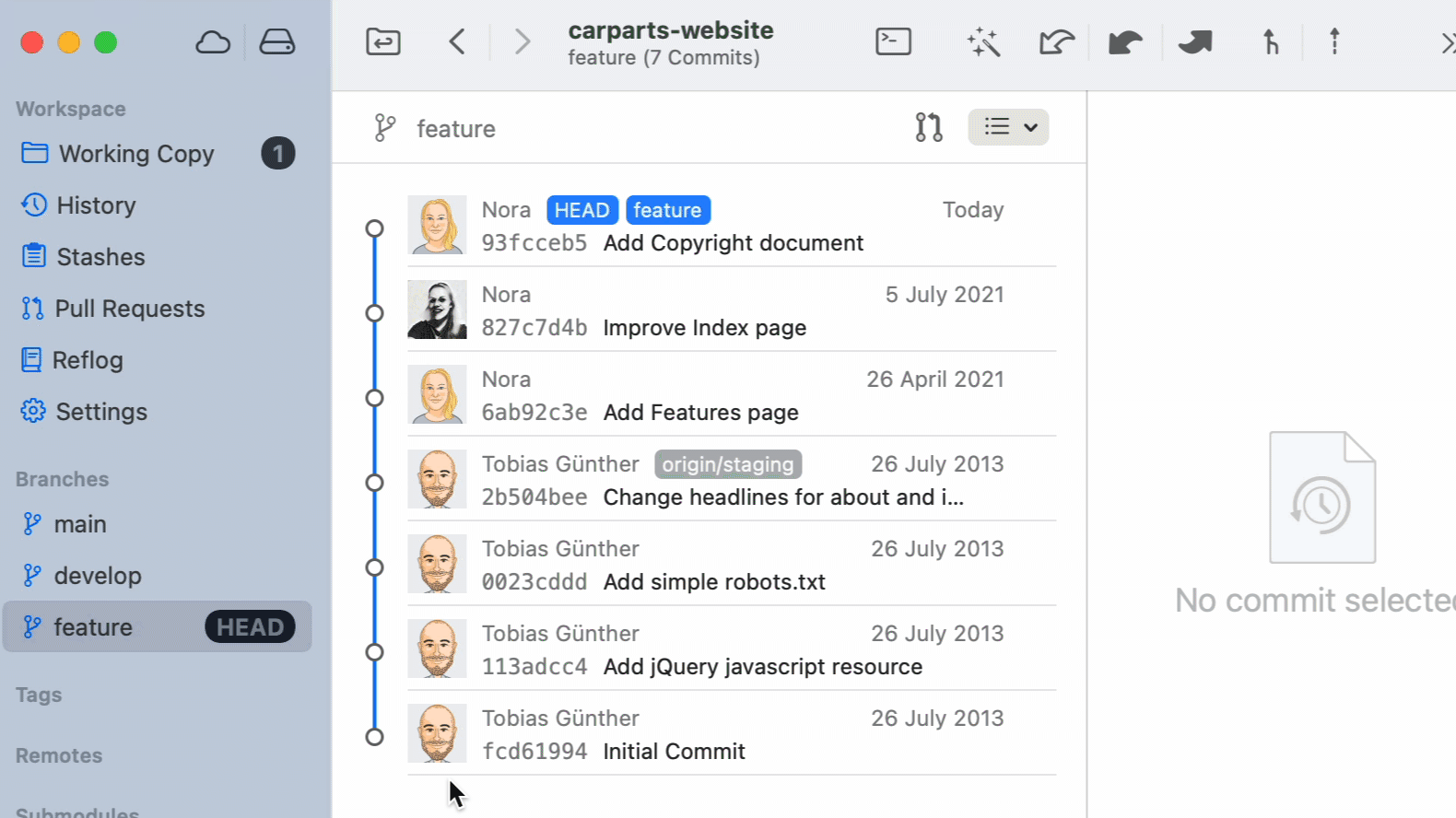 Tower also supports Git's rebase "autosquash" feature. It works similarly to amend, but it allows you to amend any (unpushed) commit in the History, not just the last one.