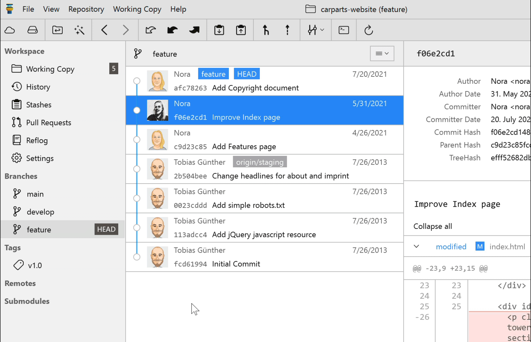 Tower also supports Git's rebase "autosquash" feature. It works similarly to amend, but it allows you to amend any (unpushed) commit in the History, not just the last one.