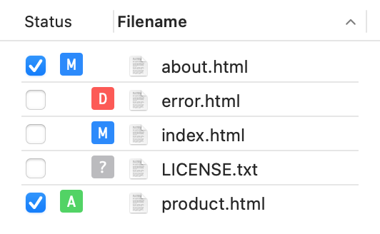 The Status column indicates both the staging status and the type of change. An icon on the left half of the column indicates staged changes while an icon on the right stands for unstaged changes. The icons symbolize: modified (M), added (A), untracked (?), deleted (D), renamed (R), and copied (C).