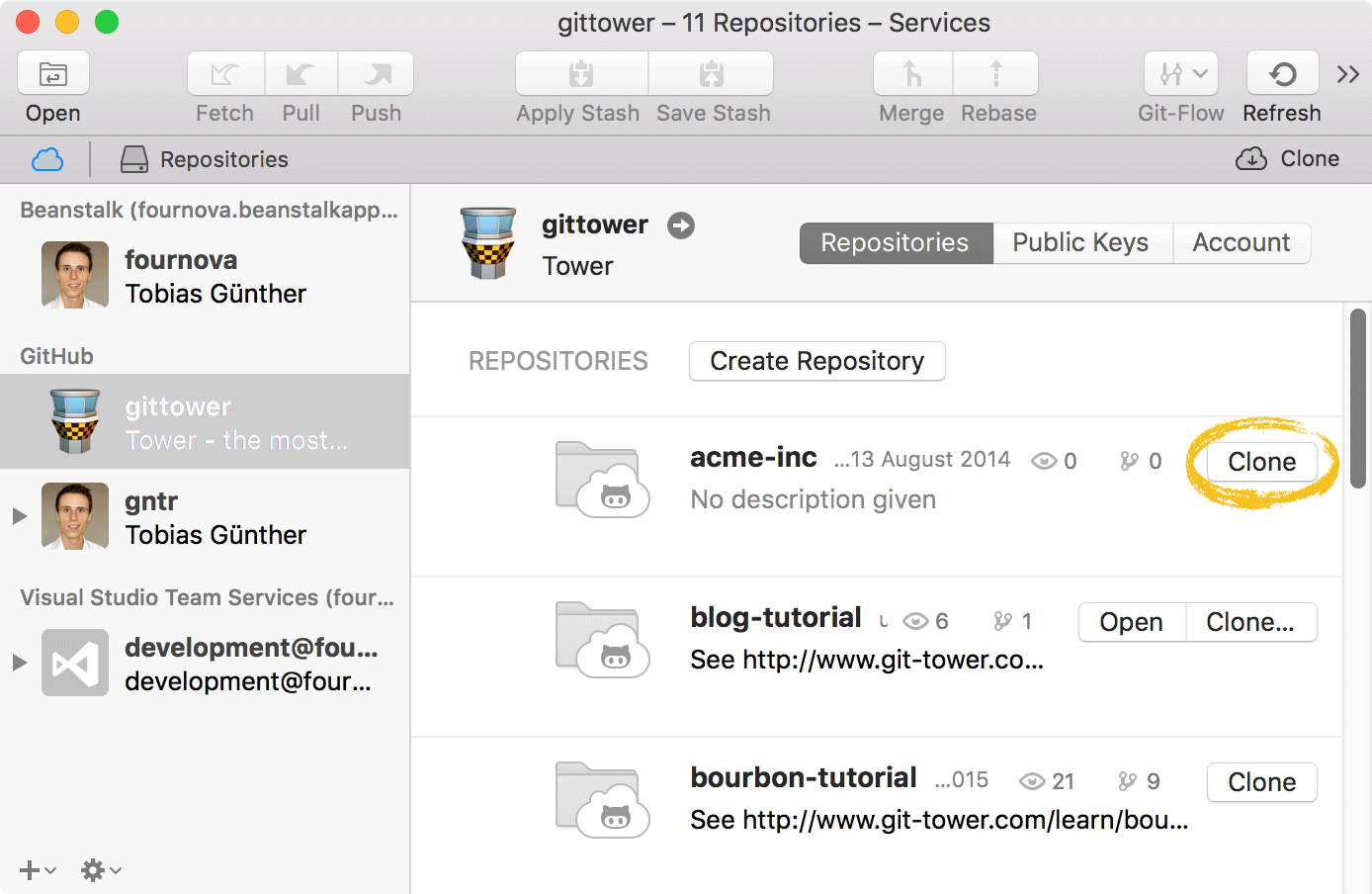 Today, many teams use a professional service to host their code repositories. If you're using one of the more popular ones (like GitHub, Bitbucket, GitLab, Microsoft Visual Studio, Perforce or Beanstalk) you can connect your service account in Tower to make cloning very easy.