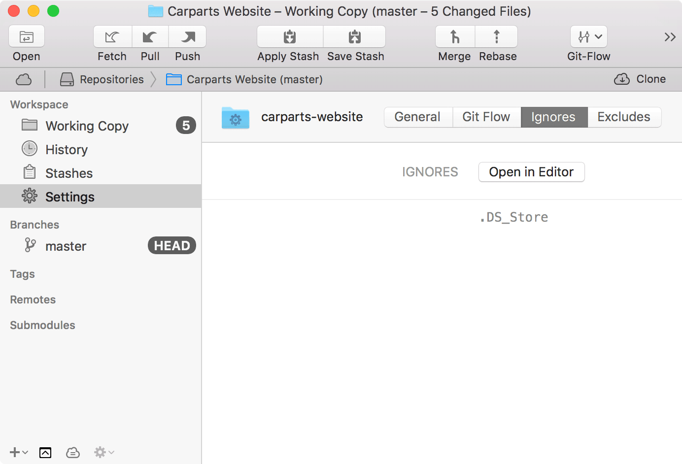 Now, let's get going: activate the Settings view in Tower's sidebar. Select the "Ignores" tab on the top right and click "Open in Editor" to have the .gitignore file created and opened for you.